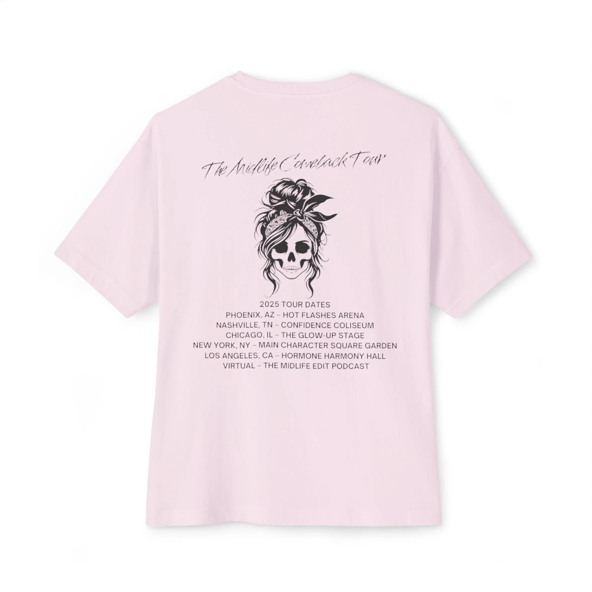 It’s not a crisis, it’s a comeback—and every comeback deserves a tour tee. The Midlife Comeback Tour Tee is your front-row pass to owning this era with humor, grit, and unapologetic energy. Featuring a bold skull-with-a-messy-bun graphic and a tour date back print that riffs on the real stages of midlife, this shirt brings rock ‘n’ roll edge with a wink of midlife truth.