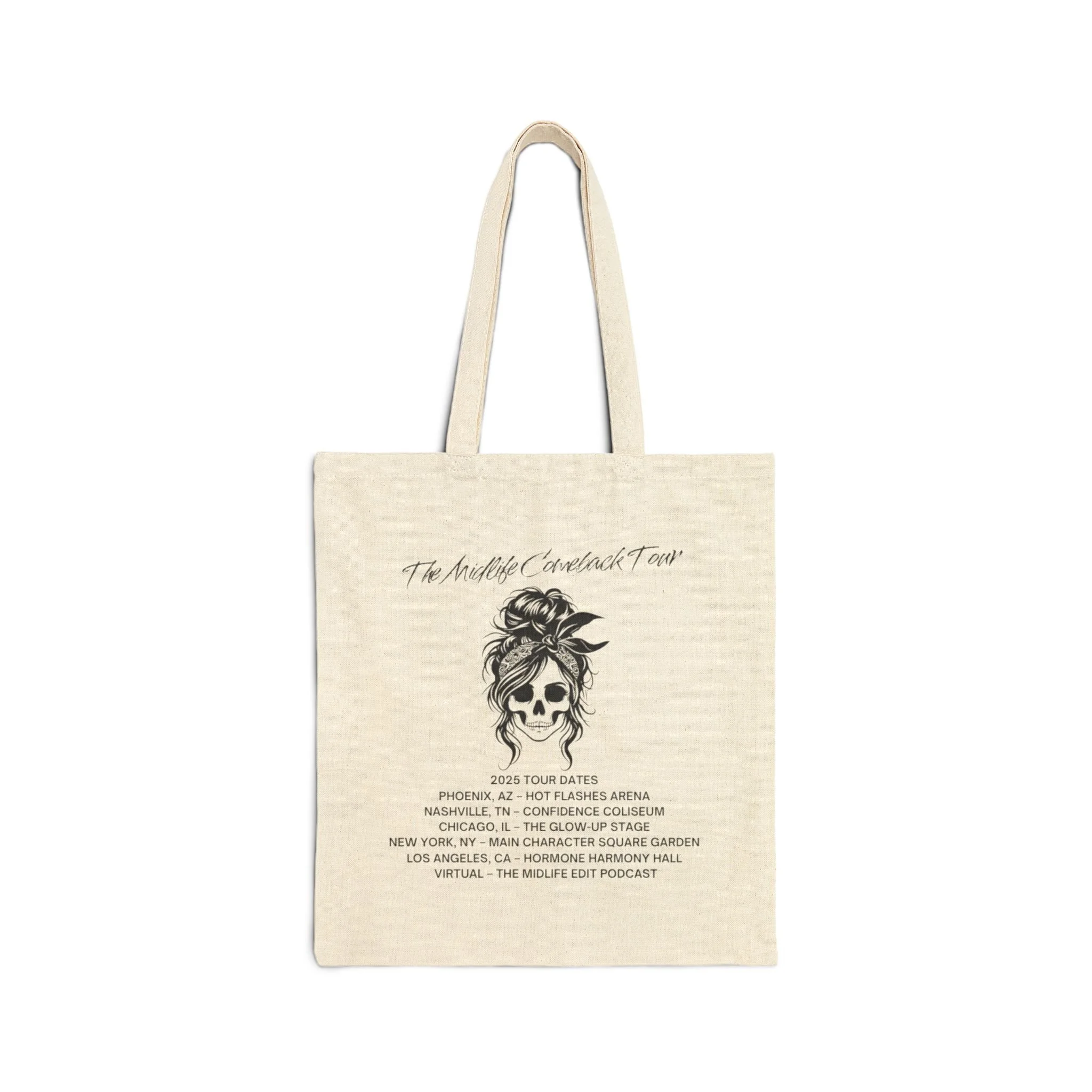 Carry your midlife comeback wherever you go. The Midlife Comeback Tour Tote is more than a bag—it’s a statement piece for women who know this era is their encore. Featuring the bold skull-with-a-messy-bun artwork and a cheeky list of “tour dates” that celebrate the stages of midlife, this tote is equal parts edgy and empowering.